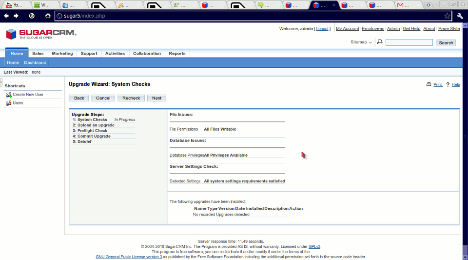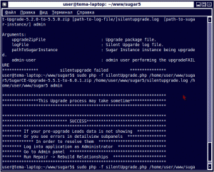 Вопрос: Я пользователь Windows, как в через командную строку обнавить sugar у меня установлена на данный момент 6.2.4 необходимо обновить до 6.3.0. Загрузил с сайта патч SugarCE-Upgrade-6.2.x-to-6.3.0, зашел в Мастер обнавления, система сделала проверку, далее загрузил через обзор файл обновления «загрузить пакет» страница перезагружается и возвращается на главную страницу шугара. В php.ini upload_max стоит 64m.