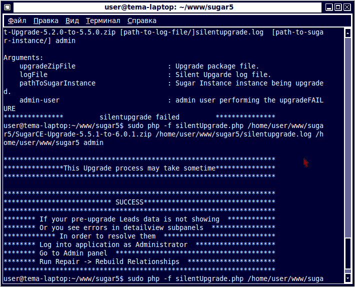 sudo php -f silentUpgrade.php /home/user/www/sugar5/SugarCE-Upgrade-5.5.1-to-6.0.1.zip /home/user/www/sugar5/silentupgrade.log /home/user/www/sugar5 admin